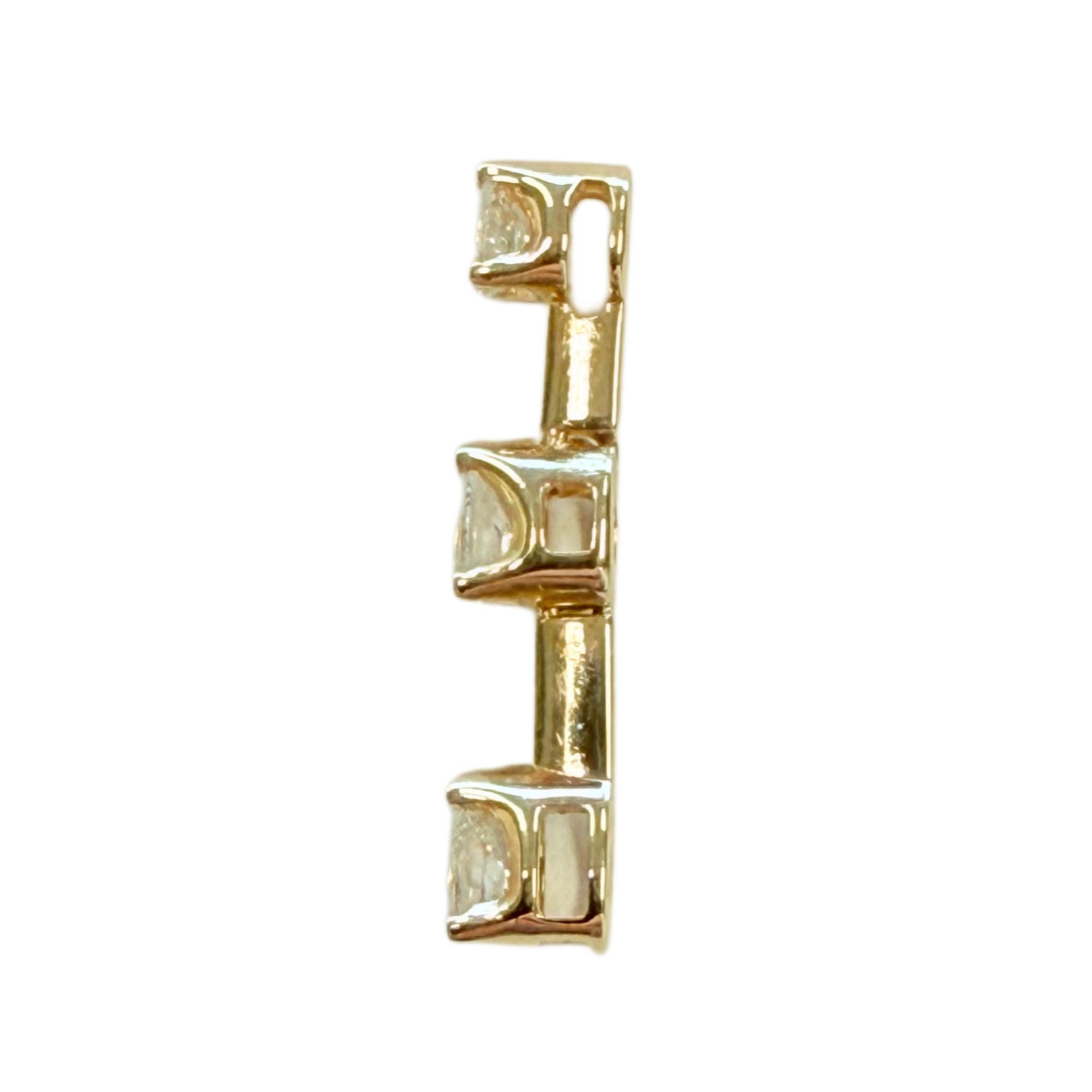 The pendant measures 3/4 of an inch in length and 1/8 of an inch in width. The bail accommodates chains up to a width of 1 mm. It boasts approximately 0.20 total carat weight and weighs 0.4 grams.