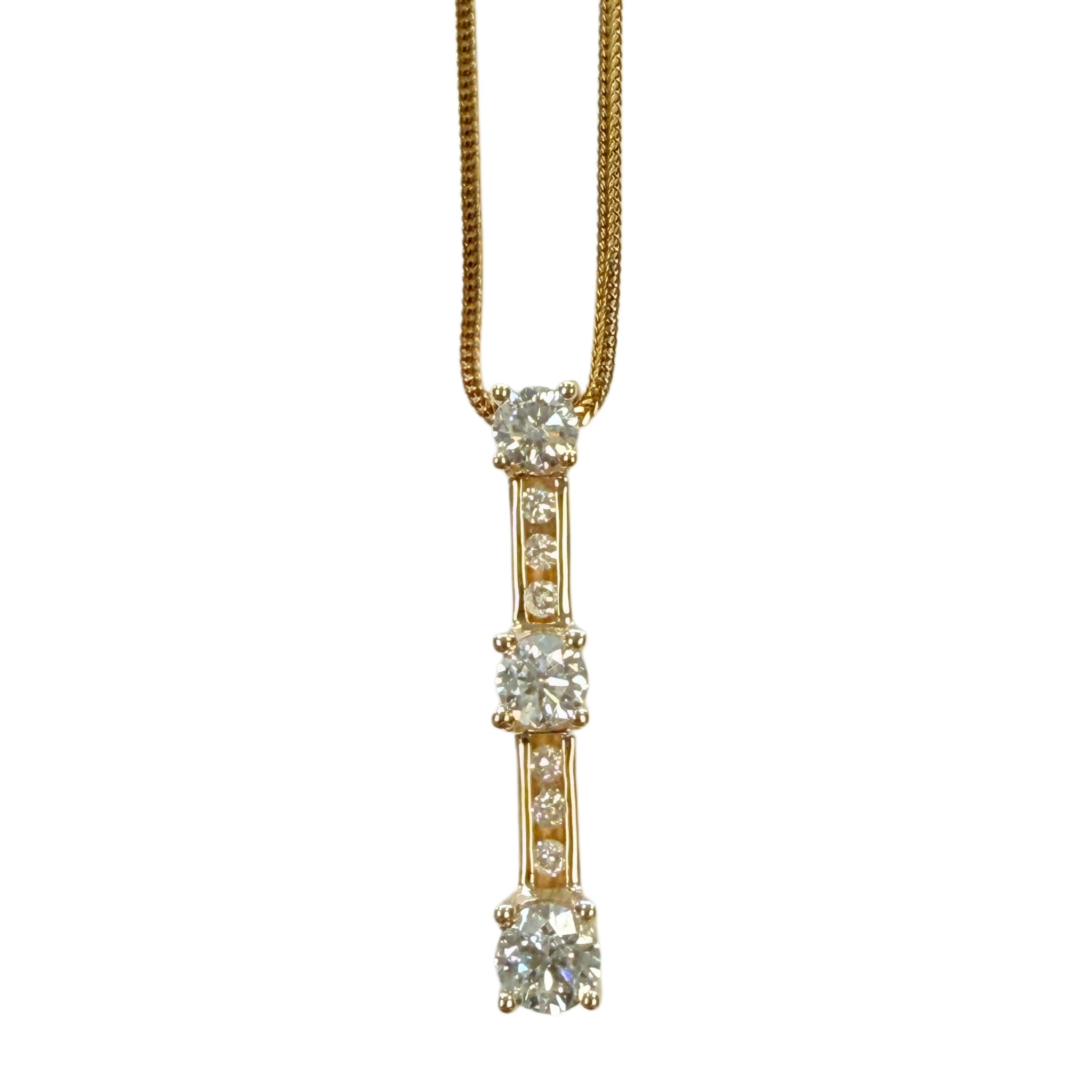 The necklace measures 18 inches in length (the most popular necklace length,) with a chain width of 1.25 mm. The pendant measures 1 inch in length and 1/8 of an inch in width. It boasts approximately 0.85 carat total diamond weight. The diamonds are all SI2 - I1 in clarity and H - J in color. Combined the pendant and chain weigh 3.7 grams.