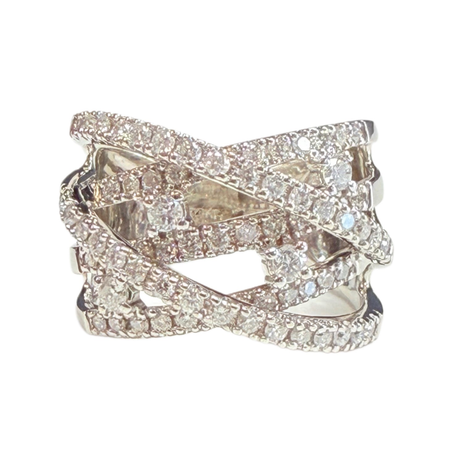 This 14k White Gold & Diamond Ring is a beautiful, statement, fashion piece. It boasts a popular crossover styled with individual strands all accented with diamonds.