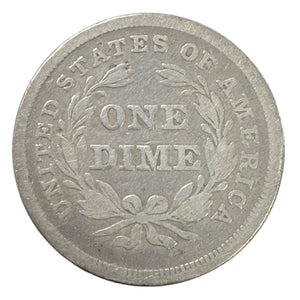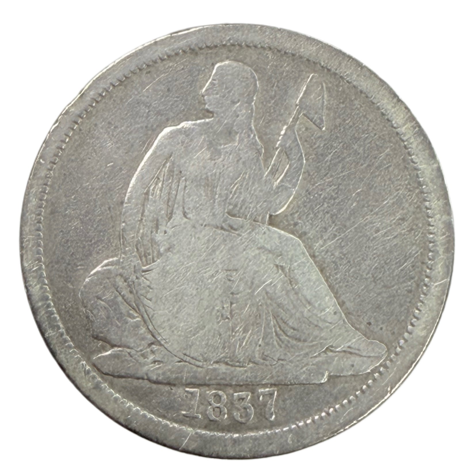 Designed by Christian Gobrecht, the obverse features a seated Liberty. In her left hand she holds a pole with a Phrygian cap, while her right rests upon a shield of the United States. She's framed by the the thirteen stars. Meanwhile the reverse features an eagle with arrows and olive branch in its talons.