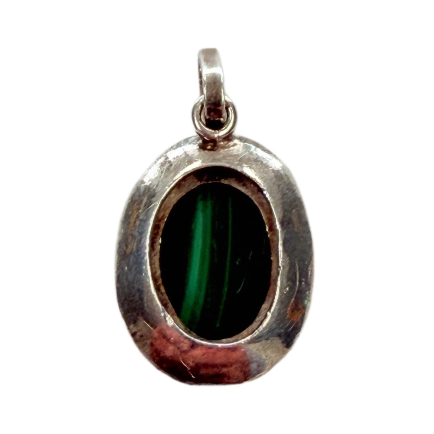 The pendant measures 1 1/8 inches in length, including the bail and 5/8 of an inch at its widest point. The bail will fit chains up to a width of 4 mm. The malachite gemstone measures 15 mm by 11 mm and it weighs 4.6 grams.