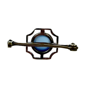 This Silver & Blue Cat's Eye Pin is a striking piece, in part due to the gemstone at its heart. This blue cat's eye is synthetic, but that doesn't detract from how eye catching it is.