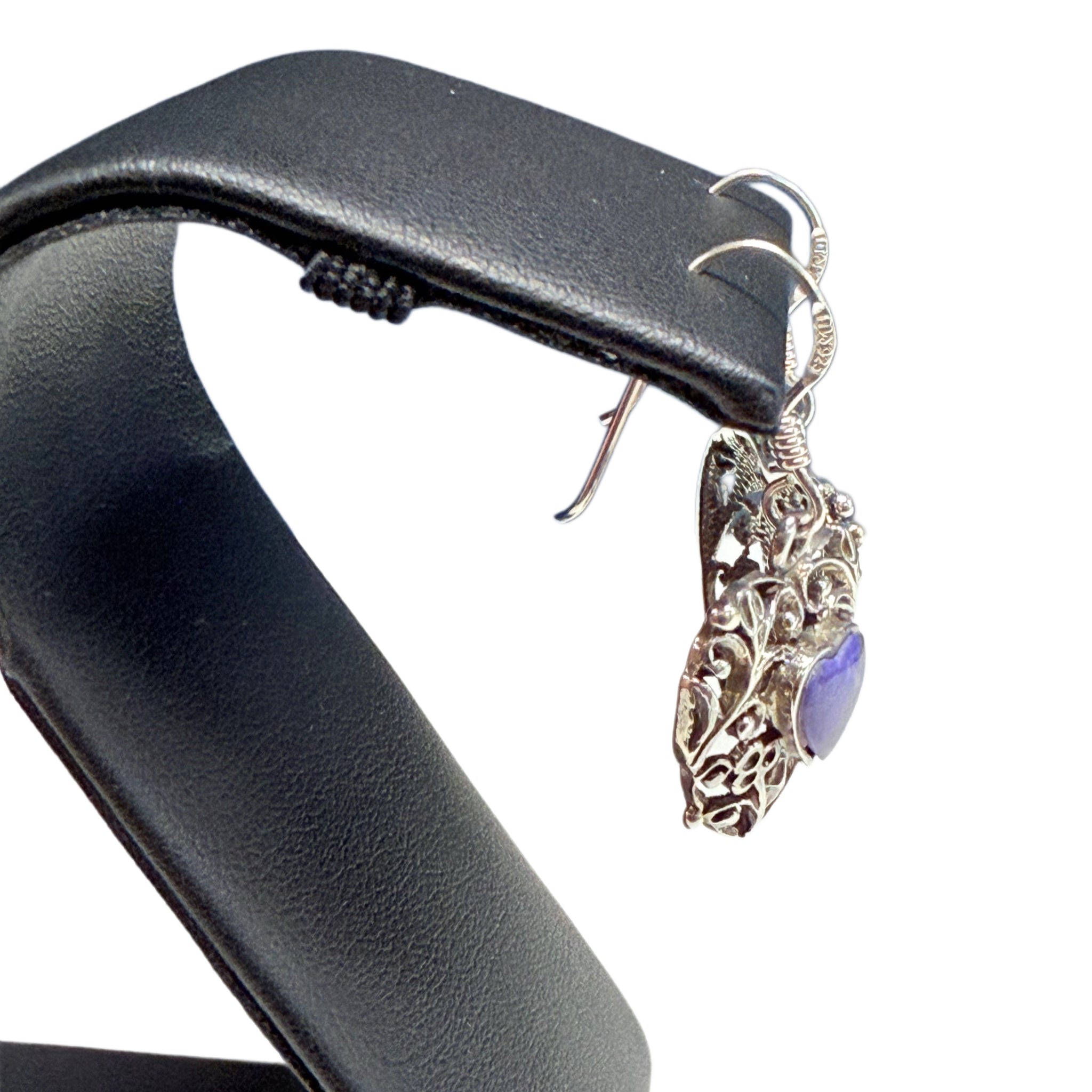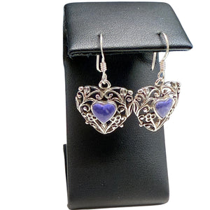 These Silver & Sodalite Heart Earrings have a feminine, ornate feel to them. At the center sit heart shaped sodalite gemstones, surrounded by filigree vine details.