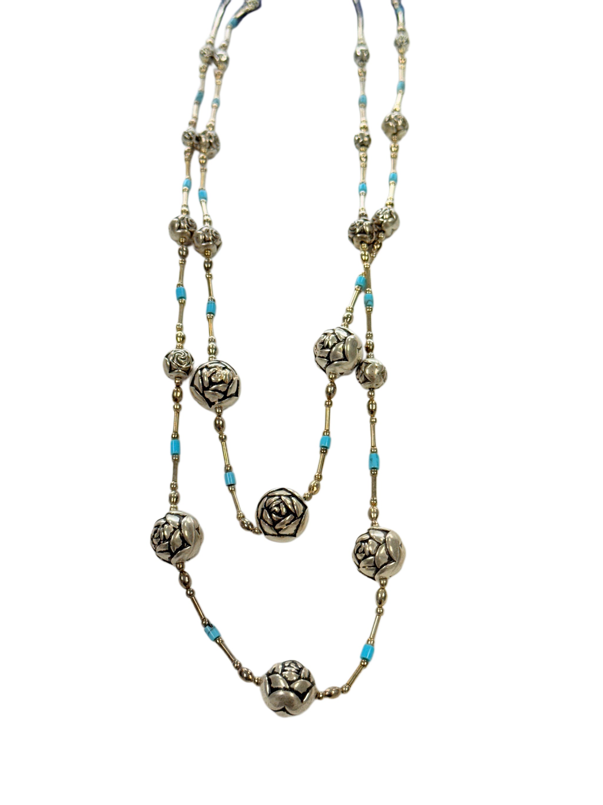 This Silver & Turquoise Lotus Necklace is such a lovely, unusual piece. The length of the necklace comprises silver and turquoise strands, punctuated with larger silver lotus beads. It's also a double strand necklace so ideal for those who love the layered look.