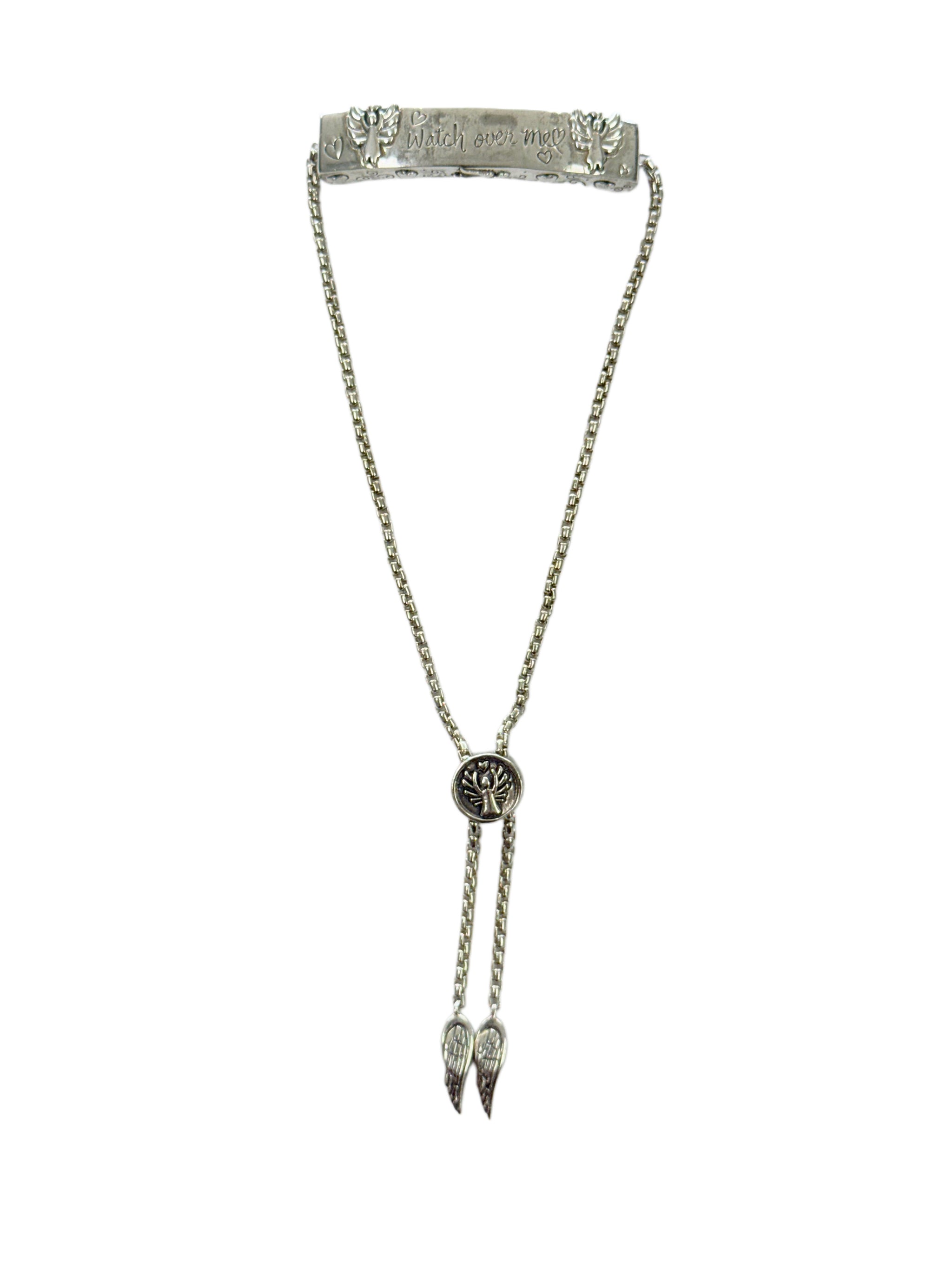 This bracelet features a slider clasp, making it fully adjustable. The plate at the front is engraved with the phrase "Watch Over Me," while a tiny guardian angel decorates the clasp.