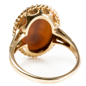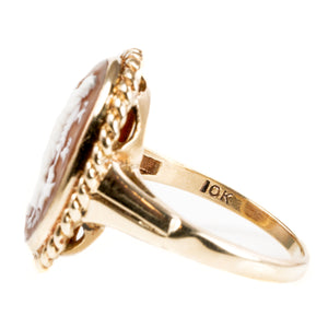 The centerpiece of this ring is a stunning cameo, delicately carved to showcase intricate details and a sense of artistry. The cameo, set against a lustrous 10K gold band, radiates a sense of vintage charm and allure. The contrast between the rich gold setting and the intricately sculpted cameo creates a mesmerizing focal point that captures attention and admiration.
