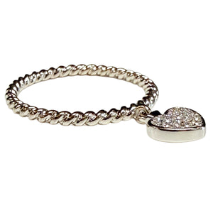 This ring is a size 7 and measures 1/16th of an inch in heigh as it sits on the finger. The little heart charm boasts approximately 1/4 of a carat total diamond weight and measures 3/8 of an inch by 1/4 of an inch. Finally the ring weighs 2.1 grams.