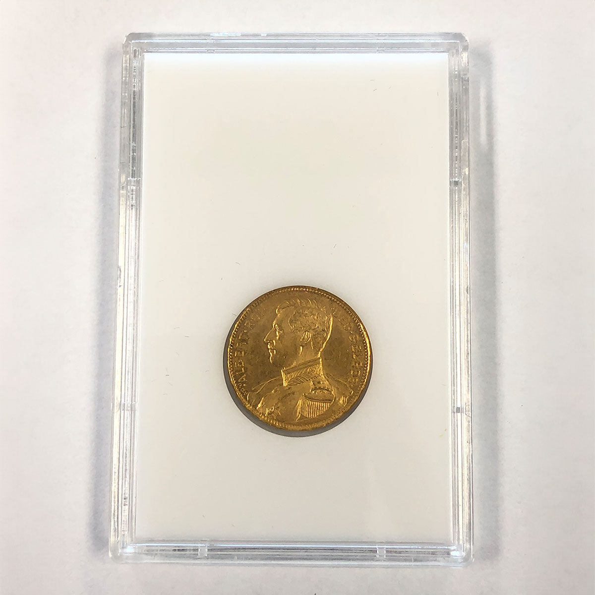 The obverse features the profile of King Albert I of Belgium in military uniform surrounded by the French inscription "Roi Des Belges" which translates to "King of the Belgians". Meanwhile the reverse features the royal coat of arms
