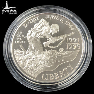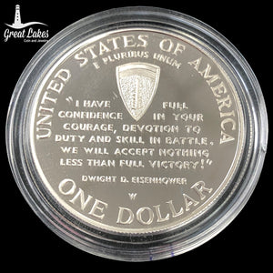 These coins were minted to honor those who served in World War II. The obverse shows an American soldier on the shores of Normandy. Meanwhile the reverse features a quote from Dwight D. Eisenhower