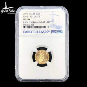 - 2016 $5 American Gold Eagle NGC MS70 30th Anniversary