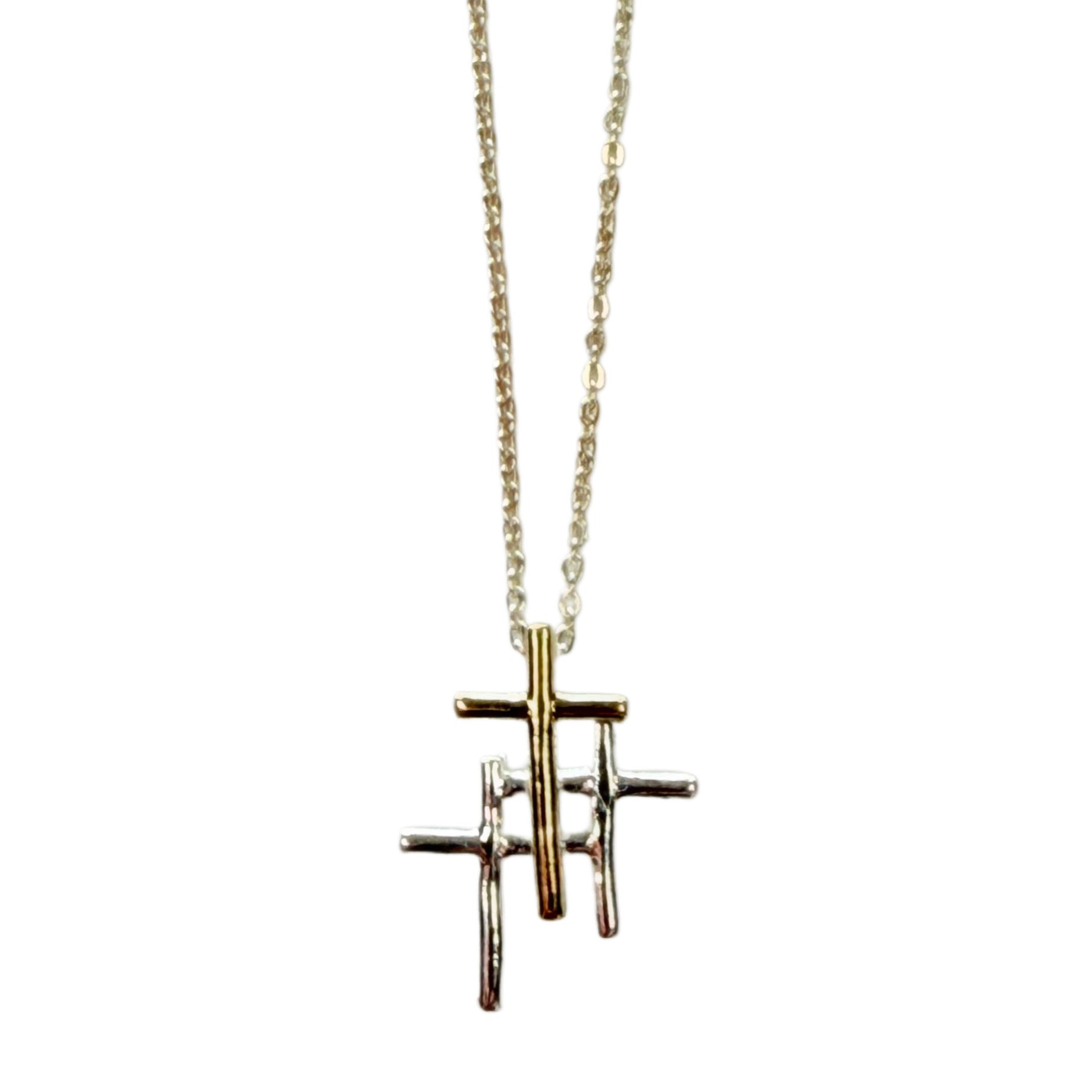 This Silver Cross Necklace is definitely unusual versus the more common styles we see. This duo tone necklace features a gold coloured cross at the forefront and then two, interlocking silver crosses at the back.