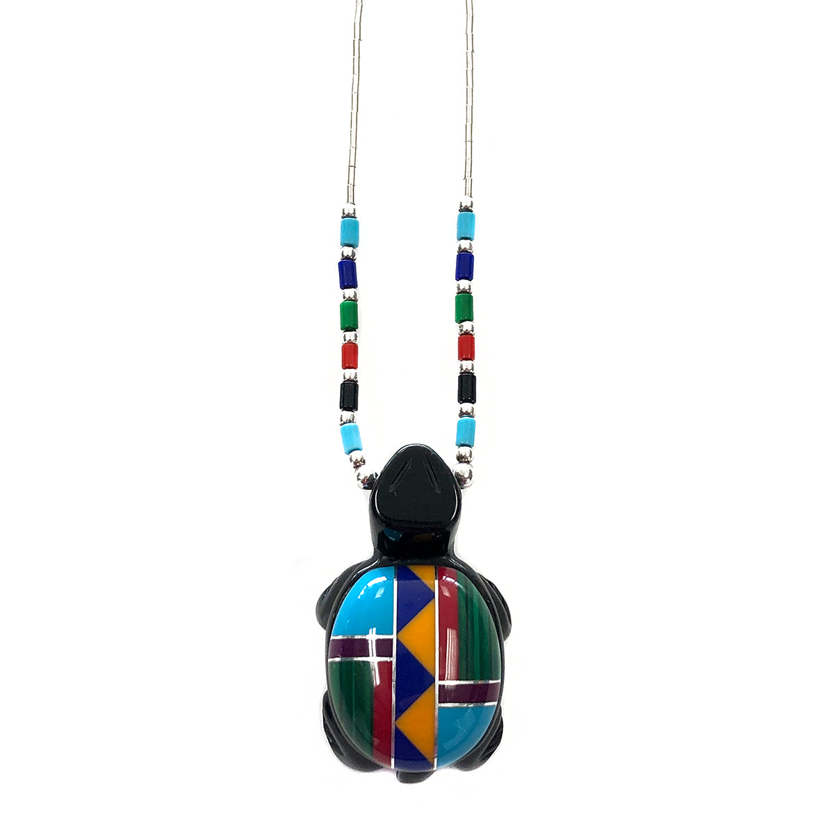 The base of this pendant is a hand carved, onyx turtle. His shell is then created out of the most beautifully executed inlaid stone work. It features turquoise, malachite, lapis lazuli, coral & amethyst.